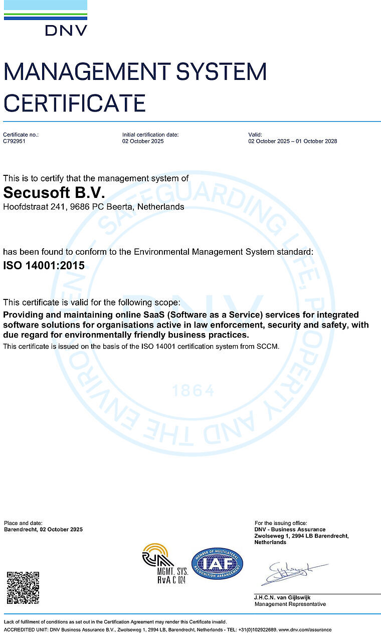 Secusoft meets all the requirements for environmental management and is proud to hold the ISO 14001 certificate, the international standard for sustainable and responsible business practices. This certification demonstrates our commitment to reducing our environmental impact and operating as a sustainable, eco-conscious company.