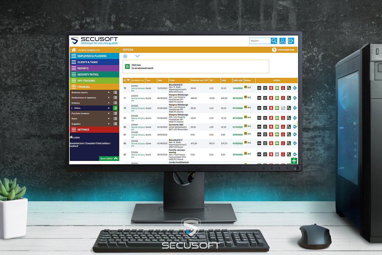 Secusoft has a built-in system with which you can easily and quickly prepare quotations, agreements and order confirmations. Short and concise, with a clear quotation and with your company logo. The quotation contains a space for signing for approval and is ready to print to the (potential) customer. Via Secusoft you can send the quotation in PDF format to the customer with a simple action.